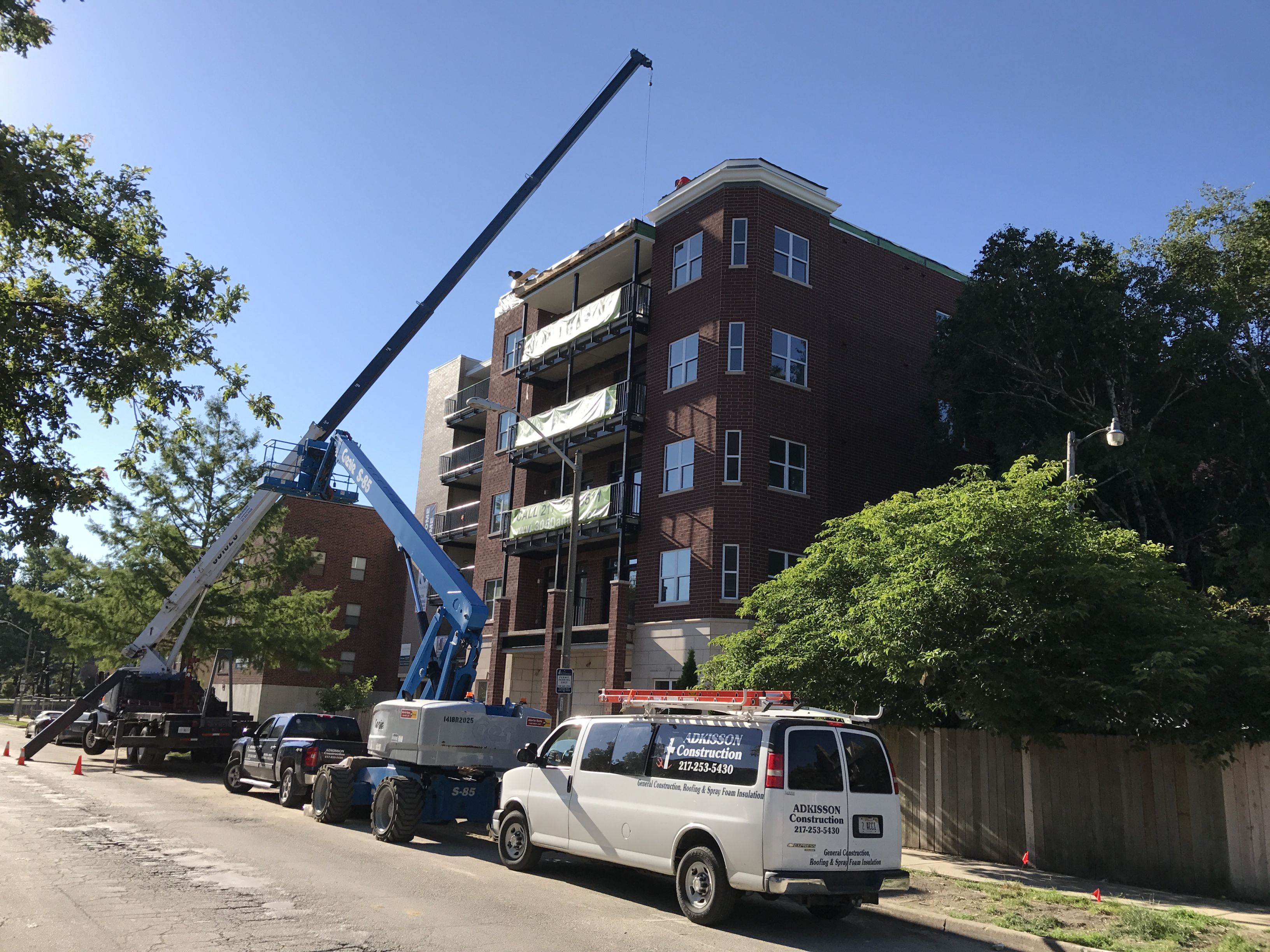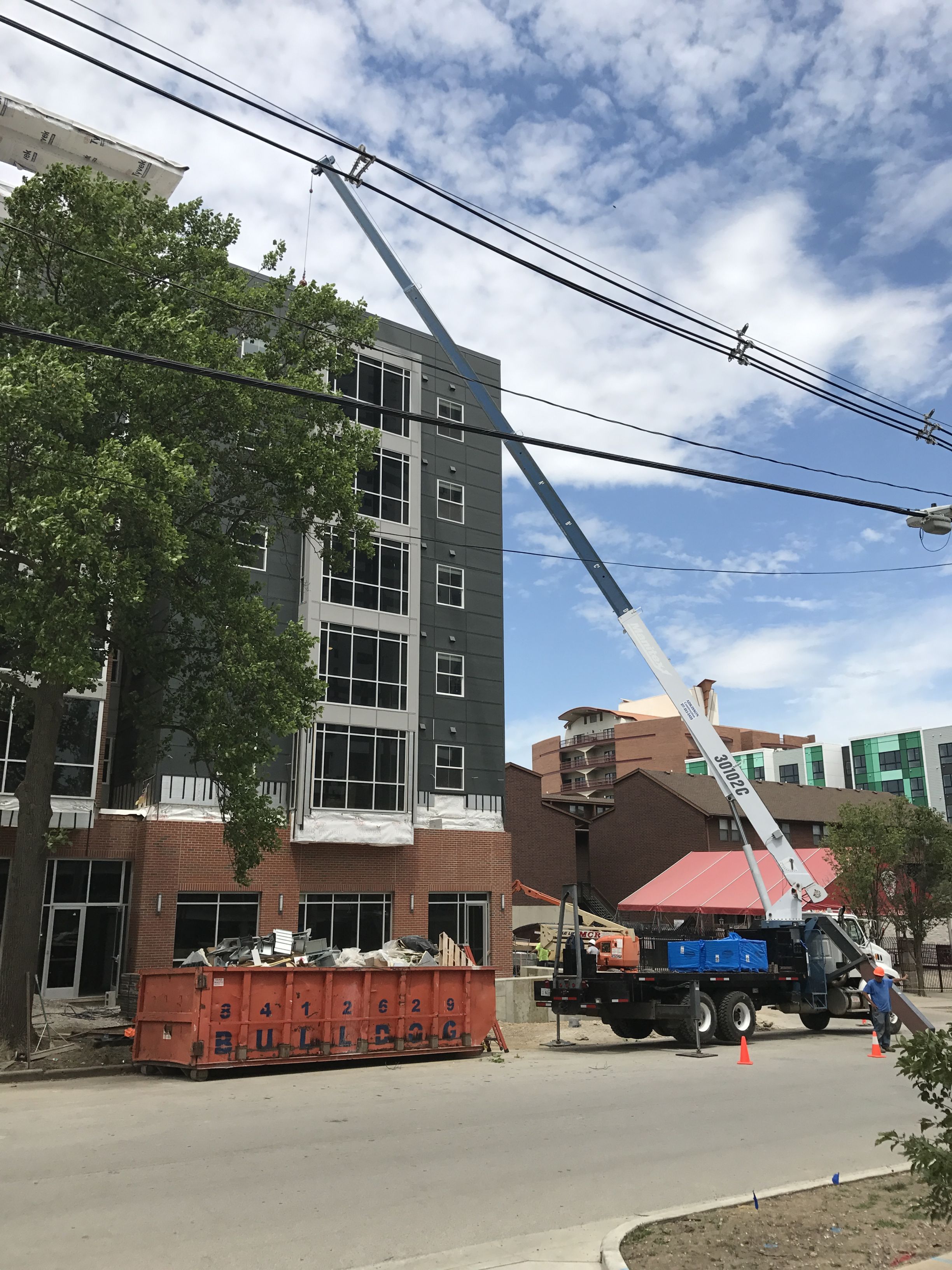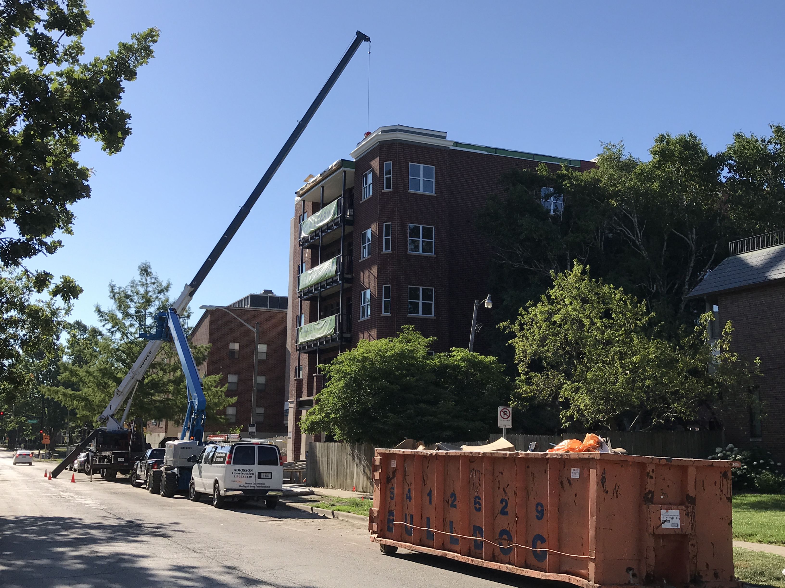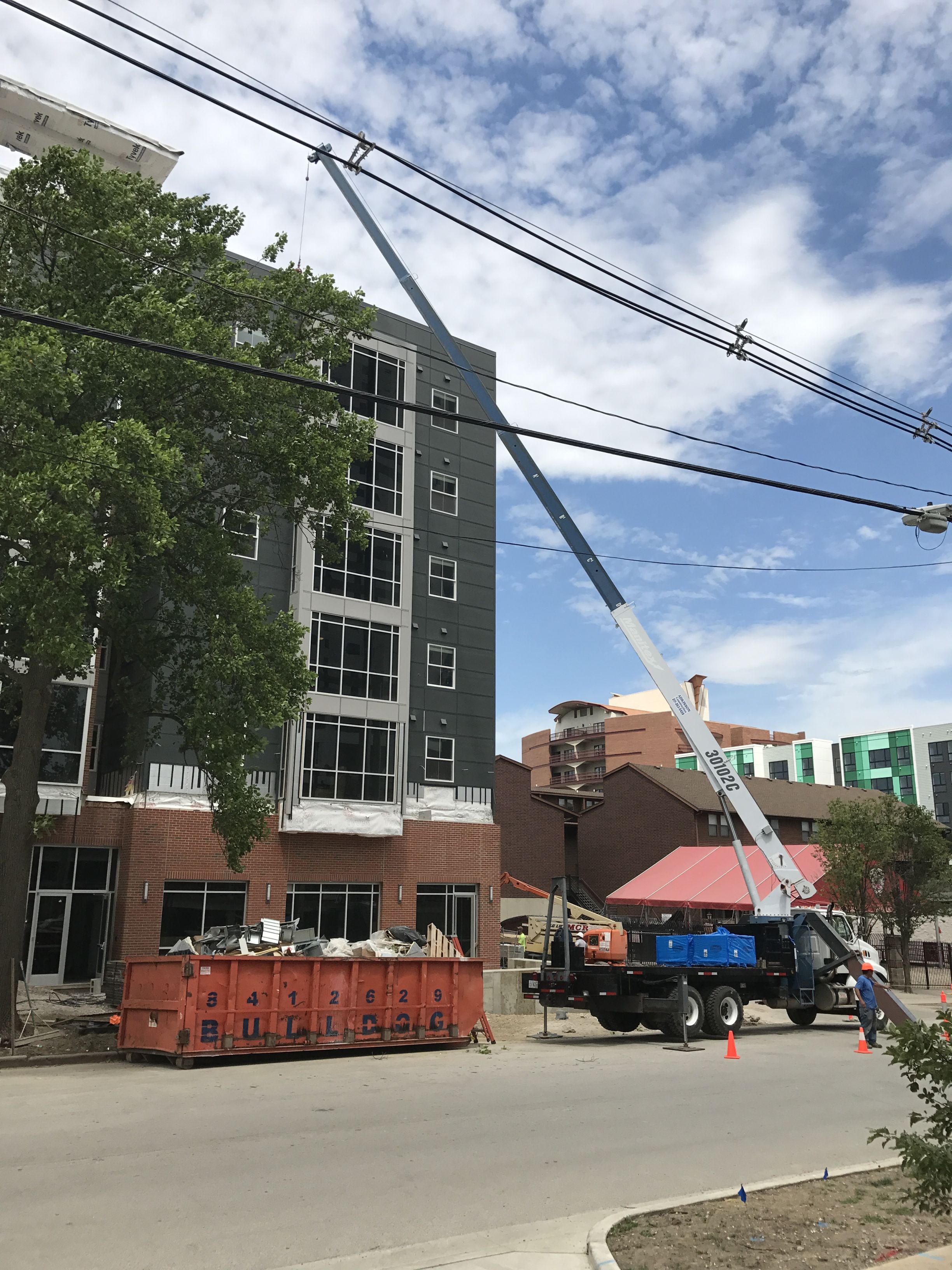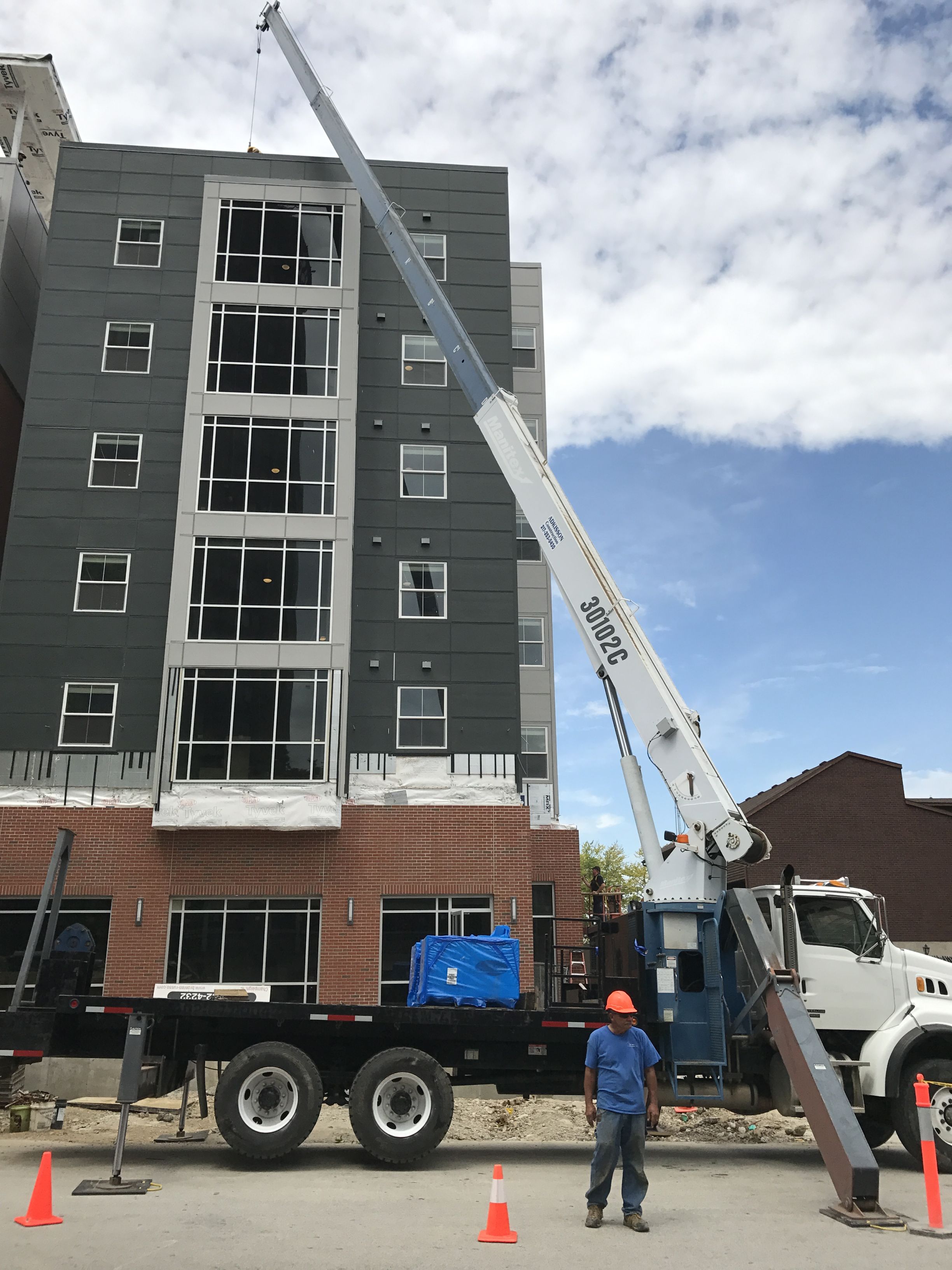 We use various pieces of equipment to finalize our roofing projects. There is a 30 ton crane we use across the commercial projects we did on campus. You can see our crane lift materials and debris to and from the roof. Our 30 ton crane has a 146' reach and we're able to reach up to a 10 story building.